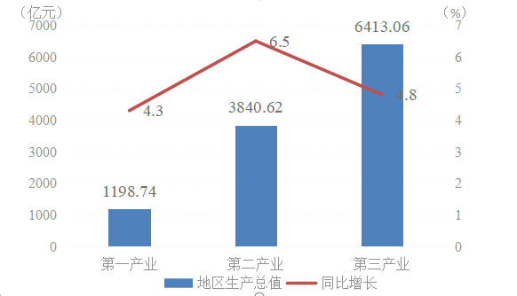 根据地区生产总值统一核算结果,上半年全省地区生产总值11452.42亿元,按不变价格计算,同比增长5.3%。其中,第一产业增加值1198.74亿元,同比增长4.3%;第二产业增加值3840.62亿元,增长6.5%;第三产业增加值6413.06亿元,增长4.8%。