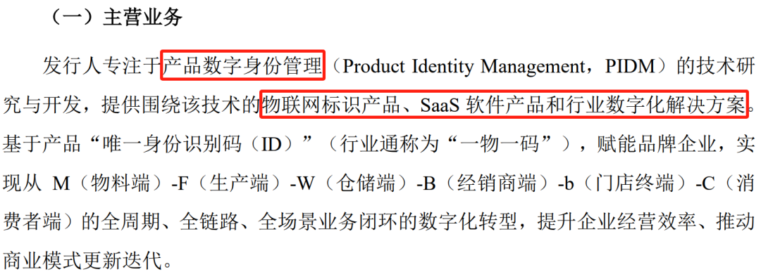 这个企业做的实际上是防伪标识。他说的物联网标识,实际上就是做的防伪码。就是一些高端的消费品,像白酒之类的上面会有一个码,这个码你扫了过后,就能验证到这个东西的一个真实性,是不是假货,发行人主要做的是这个业务。